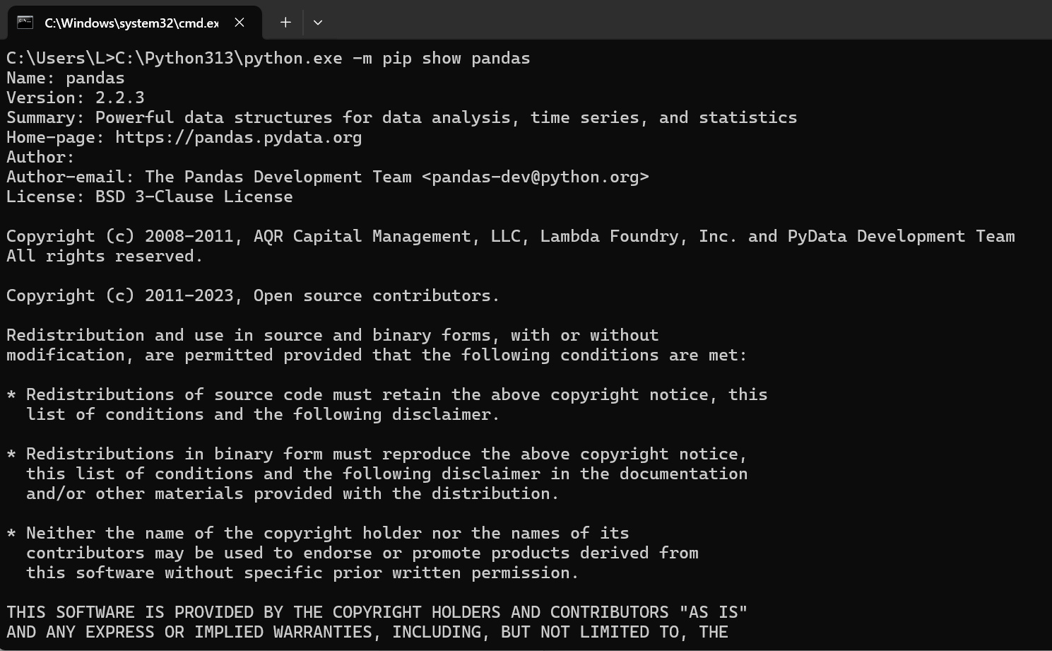 如果输出为空或者提示:WARNING: Package(s) not found: pandas则说明没有安装。