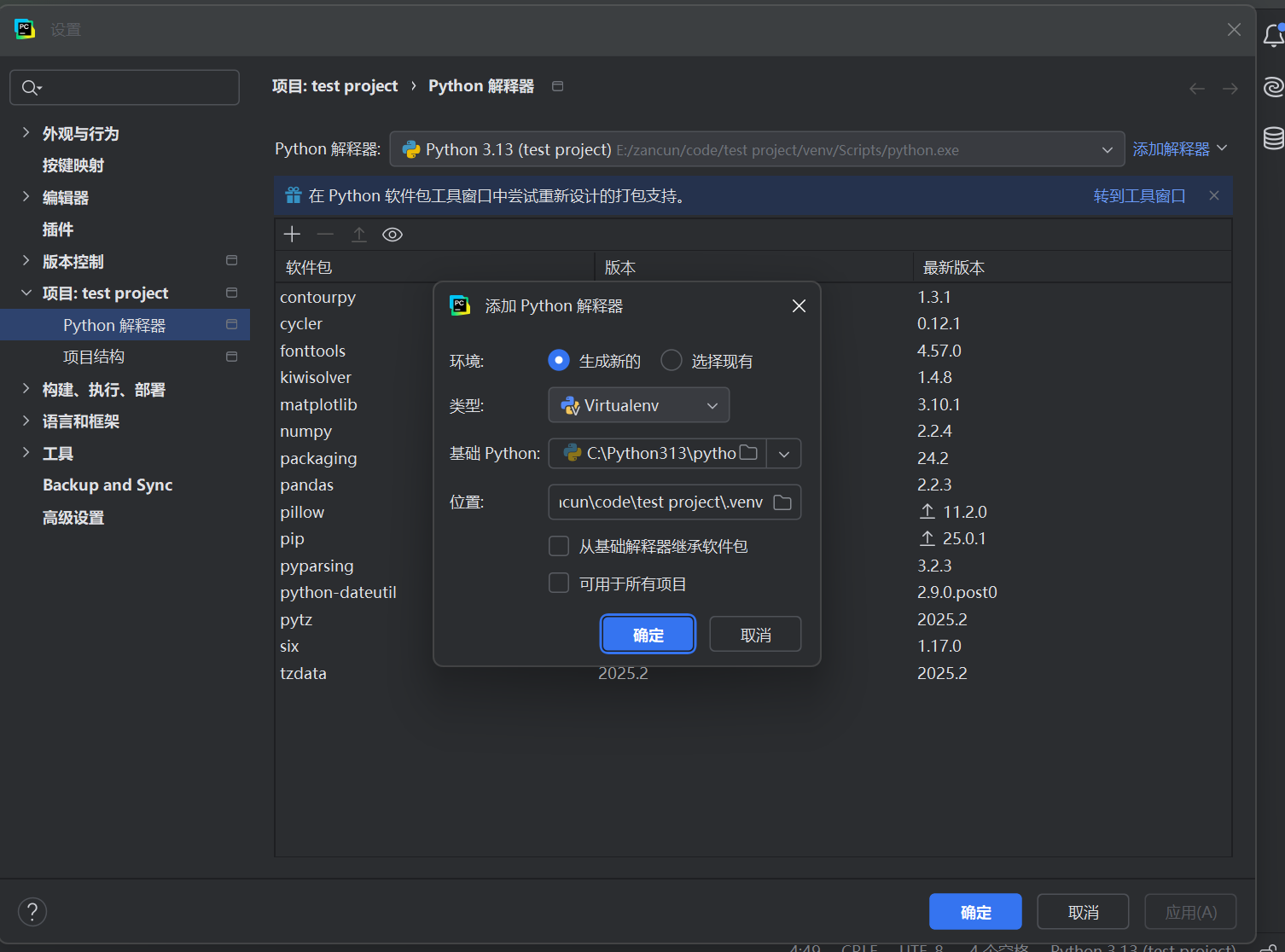创建虚拟环境(venv)时,默认情况下它是完全隔离的,不会“自动继承”你全局 Python(比如 C:\Python313)已经安装的包。所以即使全局 Python 有 pandas,虚拟环境里也看不到。