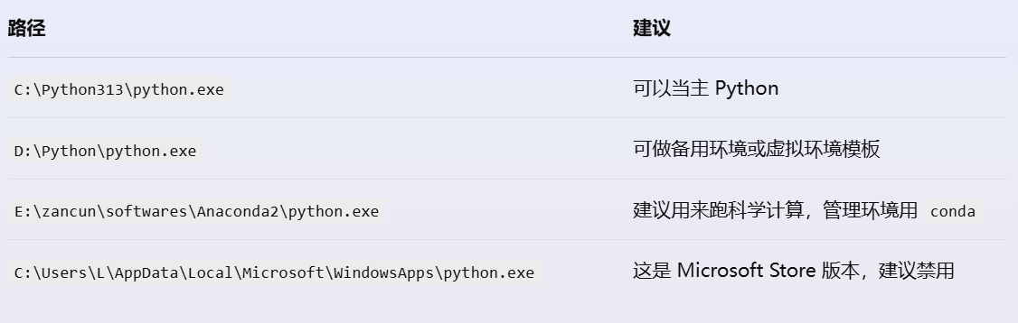 前三个大概是我自己安装的,第四个就是在APPs里面的应该是电脑自带的,其中E盘的Anaconda是一个开源的 Python 发行版(专注于数据科学、机器学习和科学计算。它集成了常用的数据科学工具包,并提供强大的环境管理功能。)(应该可以当作一个加强版的python)(前段时间刚刚安装的)