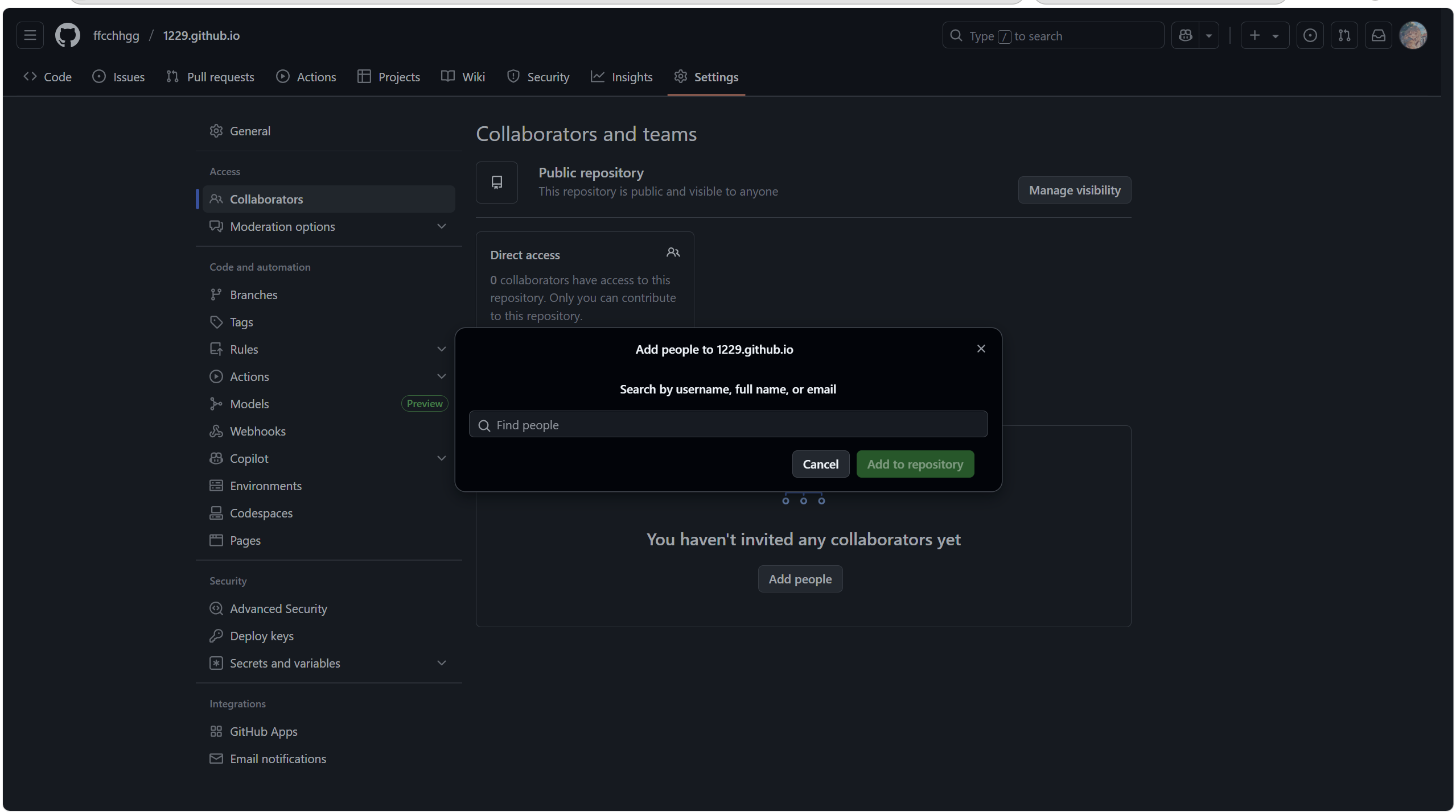 Collaborators,然后点击右侧Manage access中的“Add people”,然后在弹出的框中输入想要邀请的人的用户名或者邮箱.